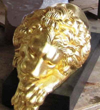 The art of gilding is an ancient technique using the same materials and methods today as hundreds of years ago. First the structure is built and carved, then gesso, which is made from animal skin glue and whiting(ground chalk), is gradually applied, producing a hard, evenly smooth layer. Red, black, blue, or yellow clay or bole is painted on the smoothed gesso surface. 22kt gold leaf is then applied with a gilder’s tip, a thin, flat brush. The gold may then be burnished with an agate stone, or rubbed and antiqued, depending on the desired finish.